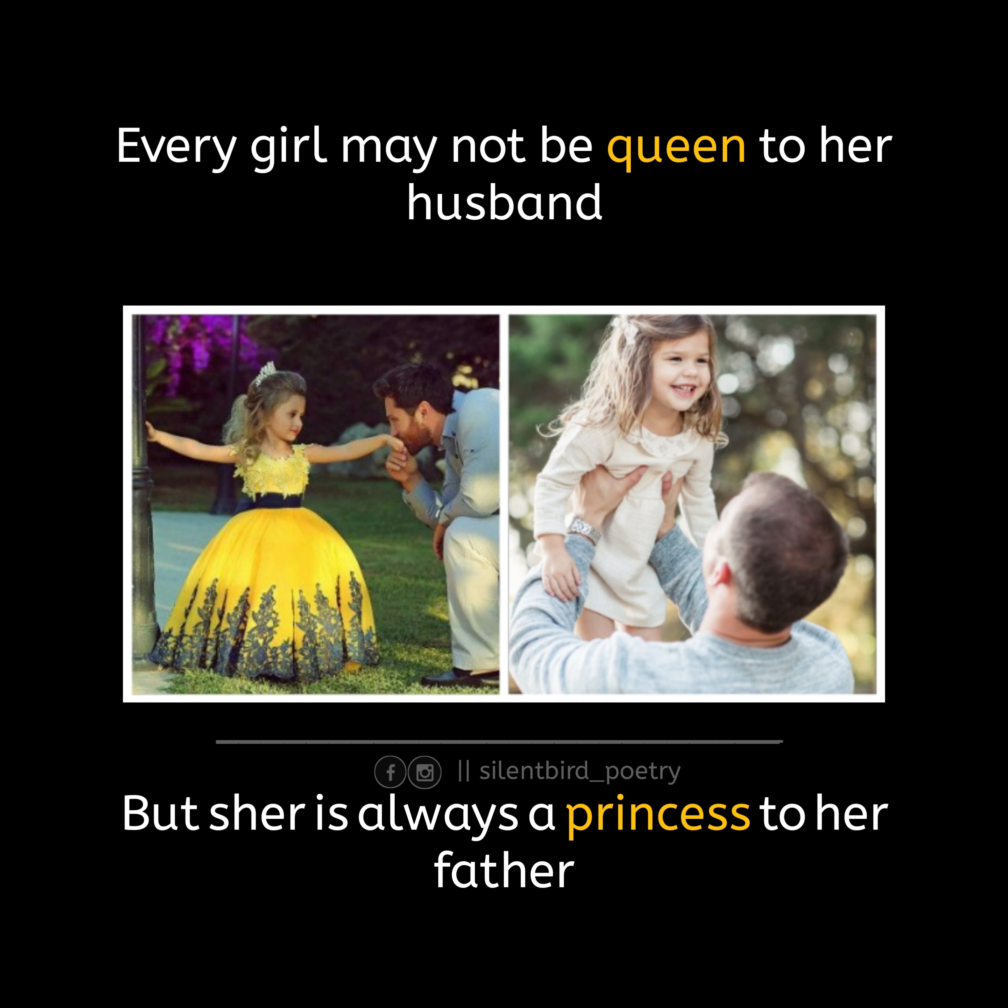 English poetry Every girl may not be queen to her husband _ but she is always a princess to her father Share this: Click to share on X (Opens in new window) X Click to share on Facebook (Opens in new window) Facebook Click to share on LinkedIn (Opens in new window) LinkedIn Click to share on Tumblr (Opens in new window) Tumblr Click to share on Pinterest (Opens in new window) Pinterest Click to share on WhatsApp (Opens in new window) WhatsApp Like Loading... Related